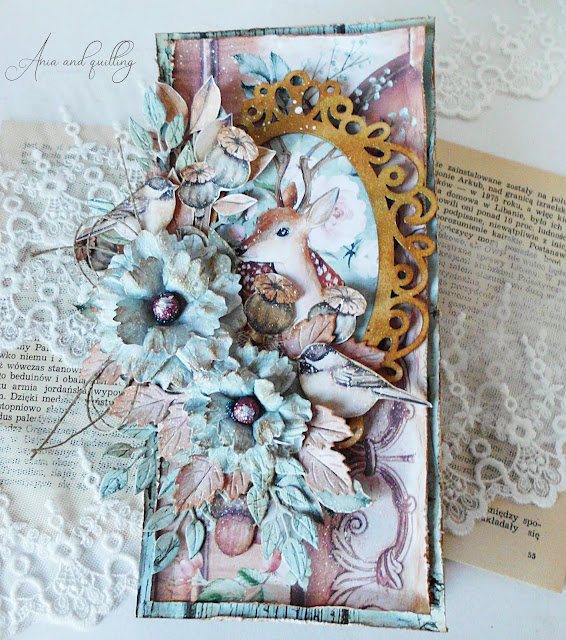 Tym razem moja inspiracja jest w leśnej odsłonie, a natchnęły mnie do jej stworzenia jesienne spacery. Kartka powstała z papierów Mintay by Karola z kolekcji Cozy Evening. Znalazły się na niej ręcznie robione kwiaty, a tekturkową ramkę nie tylko potuszowałam, ale i pociągnęłam złotą porporiną. I mamy polską złotą jesień.